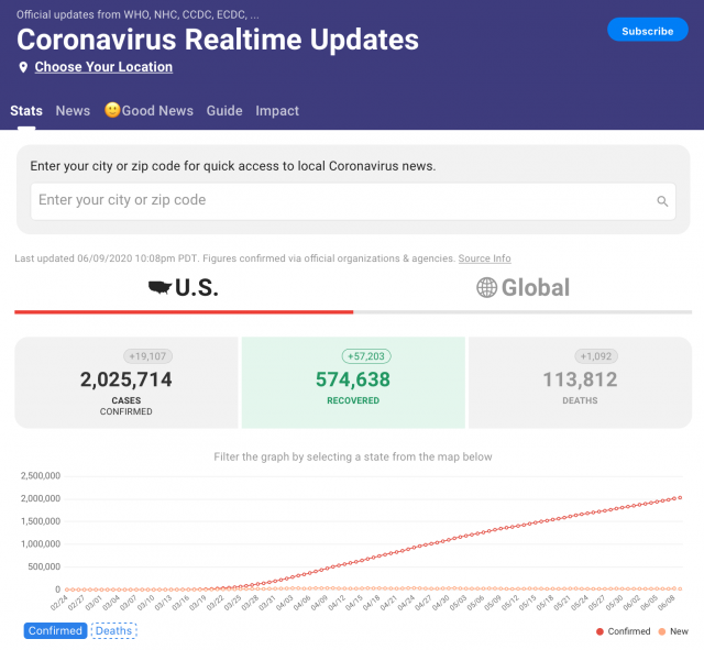 据News Break报道,根据WHO、NHC、CCDC、ECDC等官方数据,截止美国东部时间6月9日晚上10:08,美国新冠累计确诊2025714例,死亡113812例,康复574638例。