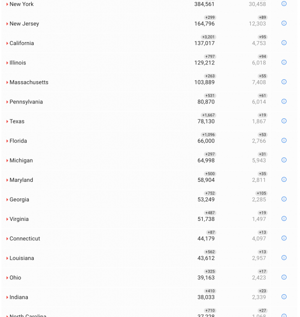 其中纽约州累计确诊384561例,死亡30458例;新泽西州累计确诊病例164796例,死亡12303例;康涅狄格州累计确诊病例44179例,死亡4097例;宾夕法尼亚州累计确诊病例80870例,死亡6014例。
