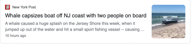 据侨报纽约网报道,新州海岸,一头鲸鱼撞翻了一艘载有两人的渔船,导致该两人被拋入大海中。