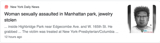 据侨报纽约网报道,警方正在搜捕一名男子,他们说这名男子在光天化日之下在华盛顿高地的公园抓住一名女子的脖子,然后对她进行了性侵犯和抢劫。