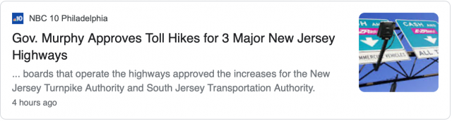 周三(6月10日),新泽西州州长墨菲(Phil Murphy)的一位发言人表示,墨菲州长在5月27日新泽西州高速路收费管理局投票通过上调通行费的当天就签署通过这项决定。