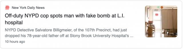 据纽约每日新闻网报道,官员们说,纽约警察局107分局的警探塞尔瓦托·比利格迈尔(Salvatore Billigmeier)晚上9点左右把78岁的父亲送到石溪大学医院(Stony Brook University Hospital)的急诊室,当他在大堂等候时发现了一名可疑男子。这名男子穿着一件军事人员使用的战术背心,口袋里有弹夹,还背着一个背包。