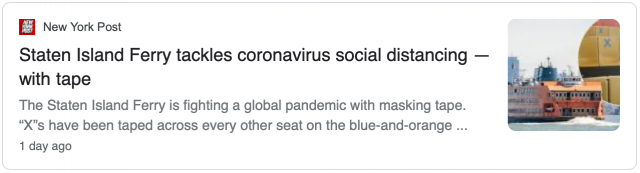 根据《纽约邮报》的报道,为了让乘客保持社交距离,史坦登岛渡轮每隔一个座位,就用胶带纸在椅背上贴出“X”的记号,表示这个位置不可以就坐。以此来保证在轮渡上就坐的乘客保持社交距离。