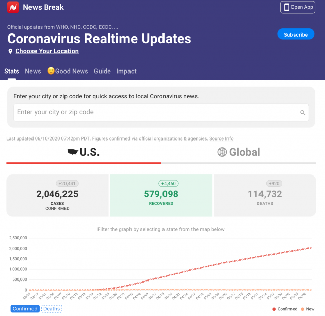 据News Break报道,根据WHO、NHC、CCDC、ECDC等官方数据,截止美国东部时间6月10日晚上7:42,美国新冠累计确诊2046225例,死亡114732例,康复579098例。