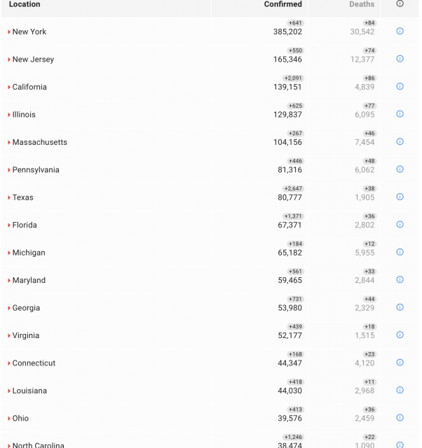 其中纽约州累计确诊385202例,死亡30542例;新泽西州累计确诊病例165346例,死亡12377例;康涅狄格州累计确诊病例44347例,死亡4120例;宾夕法尼亚州累计确诊病例81316例,死亡6062例。