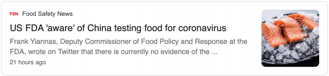 FDA食品政策与响应副专员Frank Yiannas发推说,目前美国尚无证据表明COVID-19通过食品传播,也没有与食品相关的已知或疑似病例。