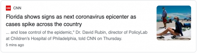 据美国有线电视网报道,根据费城儿童医院(Children’s Hospital of Philadelphia)和宾夕法尼亚大学(University of Pennsylvania)的科学家6月17日周三通过一个模型做出的预测,佛罗里达州"具备下一个疫情中心的所有标记",将成为下一个疫情"震中",并且情况会更糟。