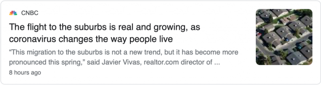 realtor.com经济研究主管哈维尔·维瓦斯(Javier Vivas)表示:"这种向郊区的移民并不是一个新趋势,但今年春季,这种迁移变得更加明显。经过几个月的居家令后,更多人希望有更多的空间和更多远程工作的潜力。”
