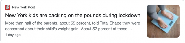 据《纽约邮报》报道,根据健身网站Total Shape对美国东海岸的5000名父母进行了调查,结果发现,自今年3月份实行禁闭以来,该地区的孩子体重平均增重7磅。
