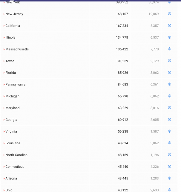 其中纽约州累计确诊390952例,死亡30974例;新泽西州累计确诊病例168107例,死亡12869例;康涅狄格州累计确诊病例45440例,死亡4226例;宾夕法尼亚州累计确诊病例84683例,死亡6361例。