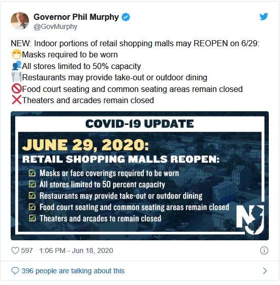 墨菲说道:“我们和新泽西州内的商场运营管理方,经过数周的讨论,决定重开室内商场部分区域和店铺。”