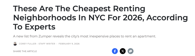 纽约依然是全美租金最高、竞争最激烈的租房市场之一。根据Zumper发布的2026年最新数据,纽约市整体租金中位数约为 $4,400。按照传统“租金不超过收入30%”的标准计算,租客年收入需要达到约 $176,000,才能相对轻松负担这一水平的房租。
