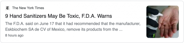 6月17日,FDA联系了Eskbiochem公司,建议他们将该公司的洗手液从市场上撤下。然而,到目前为止,该公司还没有采取行动将这些产品从市场上撤下,FDA正敦促人们停止使用这些产品,并妥善处理。