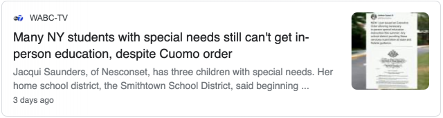 凯文·安东尼( Kevin Anthony)4岁的儿子科林(Colin)在新跨学科学校(The New Interdisciplinary School)就读,他认为,对于需要特殊教育的孩子来说,整年持续的教育非常重要,因为一旦停顿,孩子的退步非常明显。安东尼表示,由于儿子过去几个月无法接受面对面的服务和治疗,他将不得不让孩子再继续接受特殊教育一年。本来,科林已在准备就读普通班了。