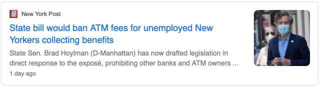 纽约州参议员布拉德·霍尔曼(Brad Hoylman)已经起草了一份法案,禁止其他银行、ATM机所有者和运营商为那些领取救济金的人增加额外费用。