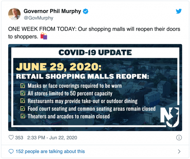 下周一(6月29日),新泽西州购物商场恢复开放,但需要遵守以下防疫规定: