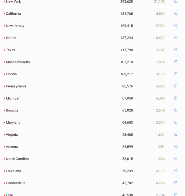 其中纽约州累计确诊393628例,死亡31176例;新泽西州累计确诊病例169415例,死亡12974例;康涅狄格州累计确诊病例45782例,死亡4263例;宾夕法尼亚州累计确诊病例86576例,死亡6426例。