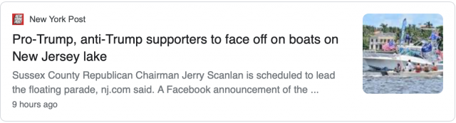 据侨报纽约网报道,新泽西水域或将面临一场政治战,总统川普的支持者和反对者都誓言要在本周末驾船在水上一比高下。