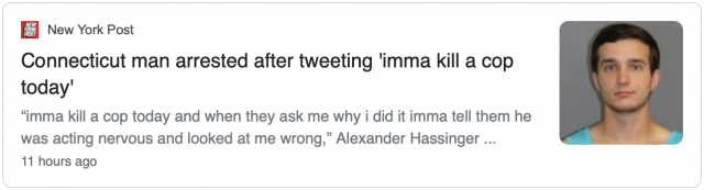 侨报纽约网报道,康州一24岁男子,在推特上发文,写道:“今天我要杀死一名警察”,数小时后,被警方逮捕。