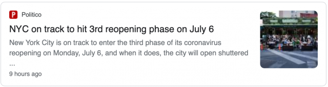 据1010wins报道,纽约市长白思豪6月25日周四表示,纽约市正按计划最早于7月6日进入重新开放的第三阶段。