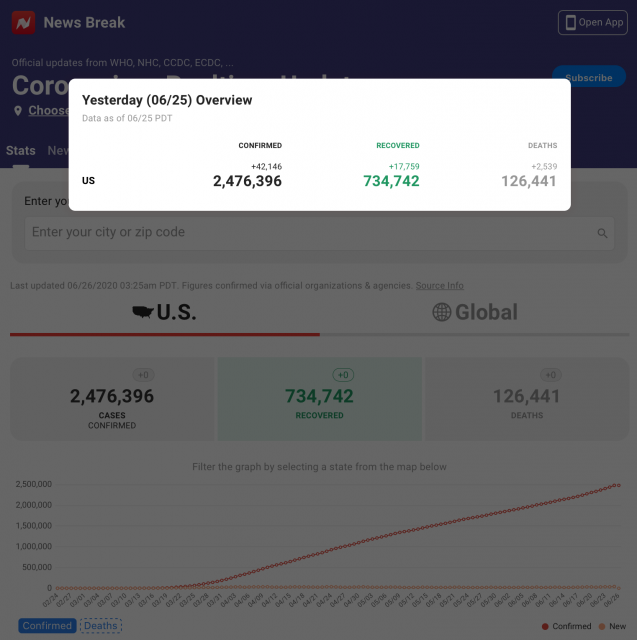 据News Break报道,根据WHO、NHC、CCDC、ECDC等官方数据,截止美国东部时间6月26日凌晨3:12,美国新冠累计确诊2476396例,死亡126441例,康复734742例。