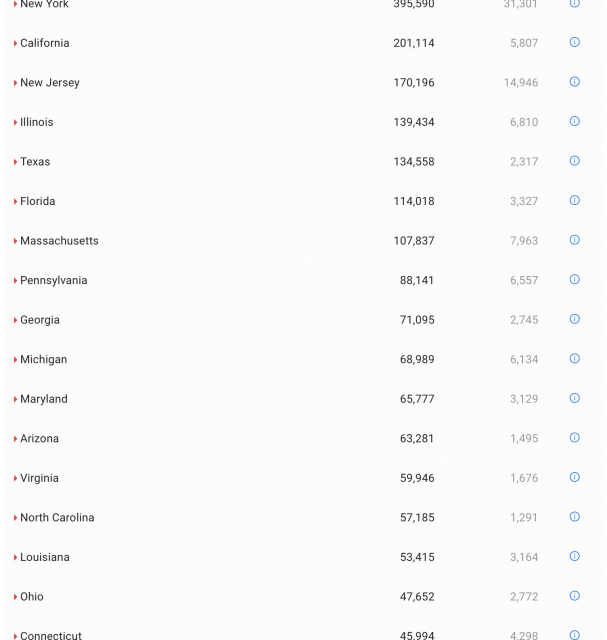 其中纽约州累计确诊395590例,死亡31301例;新泽西州累计确诊病例170196例,死亡14946例;康涅狄格州累计确诊病例45994例,死亡4298例;宾夕法尼亚州累计确诊病例88141例,死亡6557例。