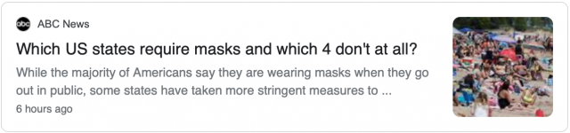 据PIX11报道,虽然一些州此前已经规定要在许多公共场所佩戴口罩,但最近又增加了几个州。要求戴口罩在很大程度上被视为一种避免重新进入居家令的方式,大多数州在春季就开始实行这种做法。