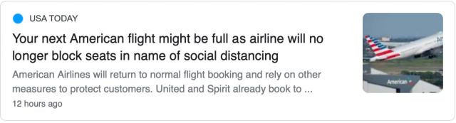 但包括达美航空(Delta)和西南航空(Southwest)在内的其他美国主要航空公司仍保留中间座位,或限制预订,以在乘客之间创造空间,以最大限度地减少疫情蔓延。