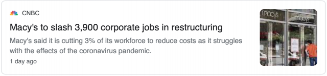 据侨报纽约网报道,梅西百货(Macy’s)本周裁撤了数千个工作岗位,这是零售业在疫情下苦苦挣扎的另一个迹象。