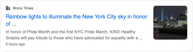 据侨报纽约网报道,为了纪念“骄傲月” (Pride Month)和第一次“纽约骄傲游行”( NYC Pride March),生产知名能量棒的KIND Healthy Snacks公司将在曼哈顿西村安装彩虹灯装置,向倡导平等的人们致敬。