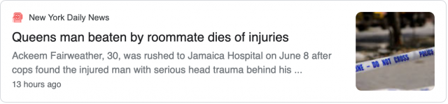 据侨报纽约网报道,警方周五(6月26日)消息称,皇后区一名男子被室友殴打致死,现在嫌疑人可能被指控犯有谋杀罪。