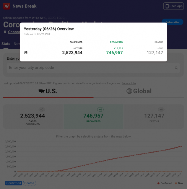 据News Break报道,根据WHO、NHC、CCDC、ECDC等官方数据,截止美国东部时间6月27日凌晨3:12,美国新冠累计确诊2523944例,死亡127147例,康复746957例。