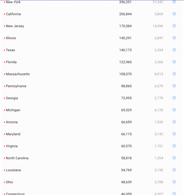 其中纽约州累计确诊396351例,死亡31342例;新泽西州累计确诊病例170584例,死亡14996例;康涅狄格州累计确诊病例46059例,死亡4307例;宾夕法尼亚州累计确诊病例88860例,死亡6579例。