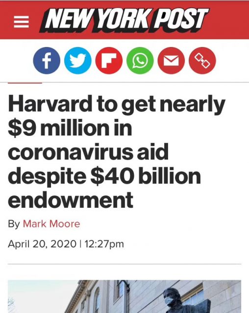 看到《纽约邮报》的报道。向哈佛大学及某些基金经理竖中指!他们居然厚颜去领取政府的补助!要知道补助资金是有限的,先来先得,救济款发完了就没了。开餐馆的小老板怎么抢得过他们这帮一向都是站在食物链顶端的精英们?!