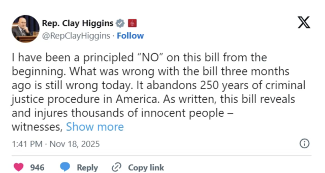 唯一一张反对票来自路易斯安那州共和党众议员克莱·希金斯。他在社交媒体上详细解释了反对理由:他认为该法案“背离了美国250年刑事司法程序”,档案若未经适当处理直接公开,“将伤害无数无辜的人”——包括证人、提供不在场证明者及其家属等都可能受到波及。他还特别指出,媒体环境 “如狼似虎” ,大规模无保留公开可能造成 “不可逆转的伤害” 。不过希金斯也表示,如果参议院后续能修订法案、加入隐私保护条款,他愿意对修正版本投赞成票。