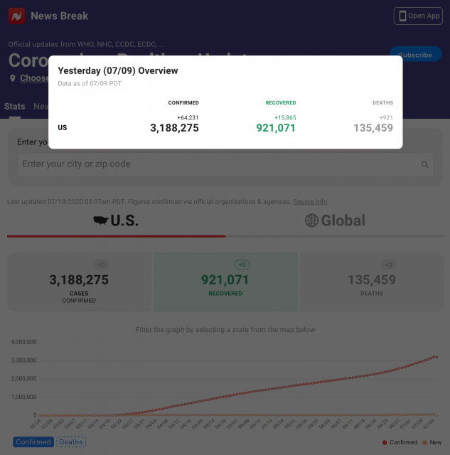 据News Break报道,根据WHO、NHC、CCDC、ECDC等官方数据,截止美国东部时间7月10日凌晨3:07,美国新冠累计确诊3188275,死亡135459例,康复921071例。
