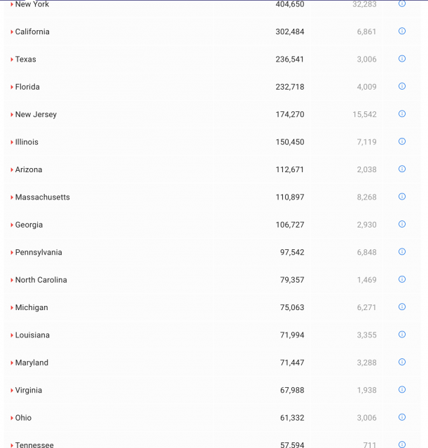 其中纽约州累计确诊404650例,死亡32283例;新泽西州累计确诊病例174270例,死亡15542例;康涅狄格州累计确诊病例47209例,死亡4348例;宾夕法尼亚州累计确诊病例97542例,死亡6848例。