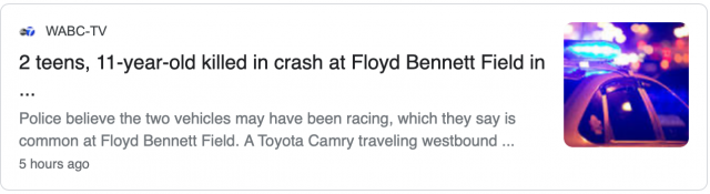据纽约邮报报道,周六(7月11日),傍晚8点15分左右,纽约市布碌仑区弗洛伊德·班尼特广场(Floyd Bennett Field)周围,航空大道(Aviation Road)和弗拉特布什大道(Flatbush Avenue)路口附近一个空旷的停车场,一群少年在玩直线高速赛车,没想到发生意外,两辆车迎面撞上。
