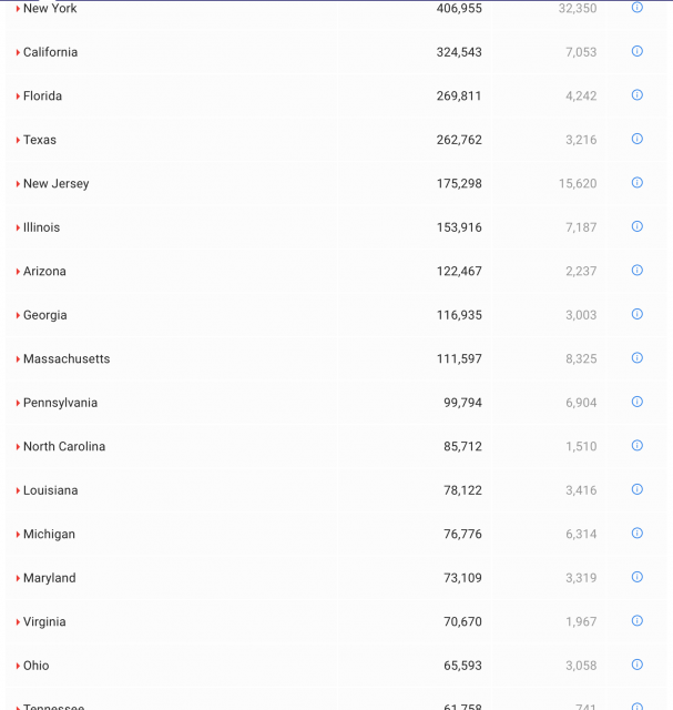 其中纽约州累计确诊406955例,死亡32350例;新泽西州累计确诊病例175298例,死亡15620例;康涅狄格州累计确诊病例47287例,死亡4348例;宾夕法尼亚州累计确诊病例99794例,死亡6904例。