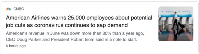 据国会山报报道,根据《CARES法案》,航空公司获得了可观的财政援助,可以在整个夏天履行工资义务。因此,禁止航空公司在9月底之前解雇任何雇员。但是,美国航空在给员工的备忘录中表示,裁员可能从10月1日开始。