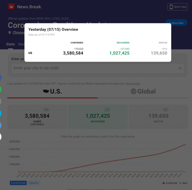 据News Break报道,根据WHO、NHC、CCDC、ECDC等官方数据,截止美国东部时间7月16日凌晨4:15,美国新冠累计确诊3580584,死亡139650例,康复1027425例。