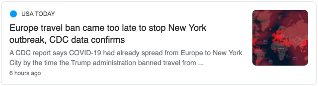 根据“今日美国”报道,CDC周五发布的《发病率和死亡率每周报告》显示,当特朗普政府颁布禁止欧洲旅客入境美国时,冠状病毒已经从欧洲传播到纽约市。