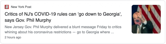 新泽西州州长菲尔·墨菲(Phil Murphy)拒绝支持纽约州州长库默(Andrew Cuomo)的提议,即对那些不向卫生官员提供联系方式的旅客予以罚款。周五,他点名佐治亚州,说那里的感染率正在上升,而该州州长布赖恩·坎普(Brian Kemp)本周已起诉亚特兰大市阻止其执行口罩指令以及与大流行有关的其他防疫措施。