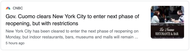 库默周五下午宣布,纽约市于7月20日周一进入第四阶段重启,但室内用餐和其他室内活动仍不开放。