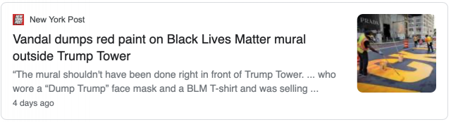 据pix11报道,周五(7月17日)下午,视频显示,涂在川普大厦外街道上的黄色字母标语被蓝色油漆泼了。