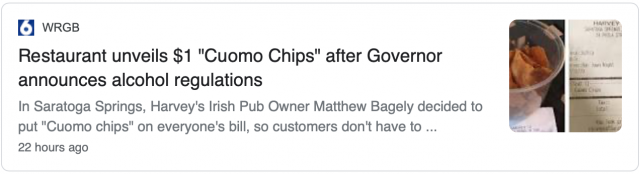 在上州的萨拉托加泉(Saratoga Springs),哈维爱尔兰酒吧(Harvey’s Irish Pub)的老板马修·巴格利(Matthew Bagely)别出心裁,在顾客的账单上印上了1美元的“库默薯片”字样,这样顾客就不用为饮酒而特意买一顿饭了。