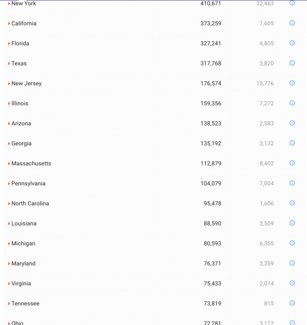 其中纽约州累计确诊410671例,死亡32463例;新泽西州累计确诊病例176574例,死亡15776例;康涅狄格州累计确诊病例47893例,死亡4396例;宾夕法尼亚州累计确诊病例104079例,死亡7004例。