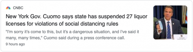 美国中文网报道,纽约州长库默周二宣布,已临时吊销了27个酒吧或餐馆的酒牌,因为他们违反了社交距离的规定。