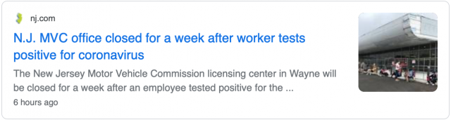 周二(7月21日),新泽西州车辆管理局(New Jersey Motor Vehicle Commission)表示,帕塞伊克郡(Passaic County),韦恩镇(Township),韦恩证件中心(Wayne Licensing Center),一名雇员被检测出感染新型冠状病毒肺炎,因此韦恩证件中心将关闭一周,进行彻底消毒清洁,凡是与这名确诊雇员有过接触的其他雇员,要自我隔离14天。
