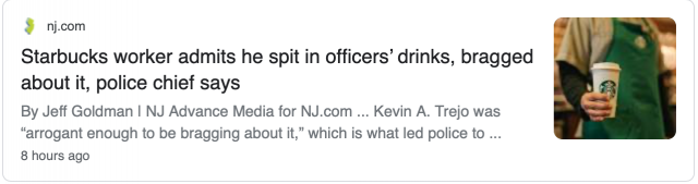 新州星巴克员工涉嫌向警察的饮料中吐口水被捕